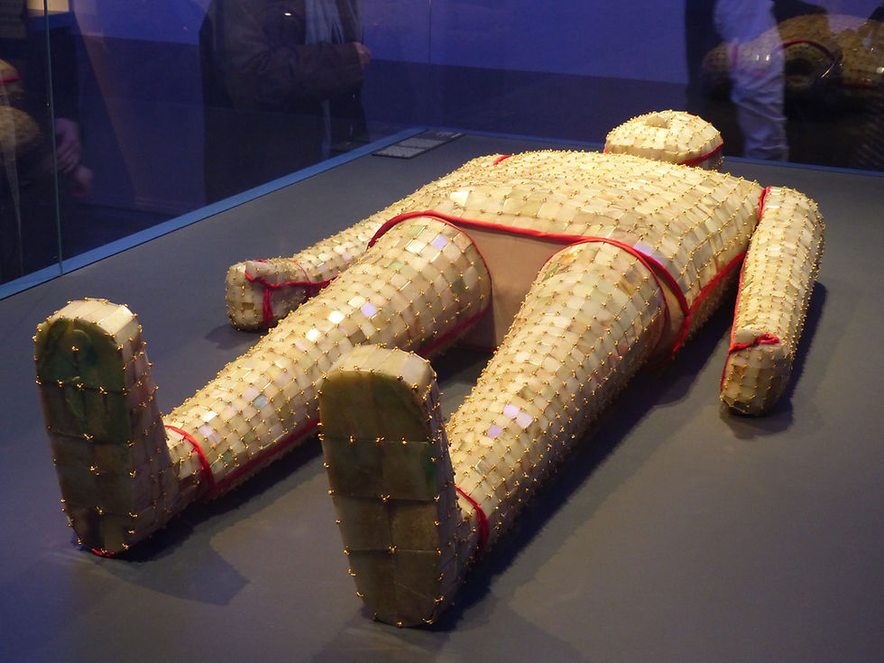Ce costume funéraire fait de plaques de jade cousues entre elles par d'épais fils d'or constitue la prescription la plus élevée de la toilette funéraire dans les rituels d'inhumation de la dynastie Han.