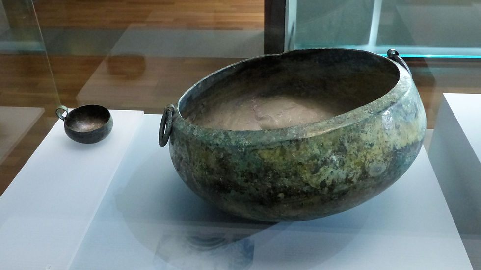 Cet objet constitue la pièce maîtresse d’un service de vaisselle comprenant une tasse à puiser ornée de fins motifs géométriques ainsi que des embouts de corne à boire. Symbole manifeste de statut social, ce chaudron a probablement été utilisé comme contenant de vin pour des banquets funéraires dont l’origine est méditerranéenne. Ce phénomène, qui est lié à des pratiques ostentatoires servant à l’affirmation des chefs ou seigneurs dans ces sociétés élitaires, féodales, est en effet mentionné par l’auteur grec Hérodote et a pu être observé dans de nombreux sites archéologiques au nord des Alpes.