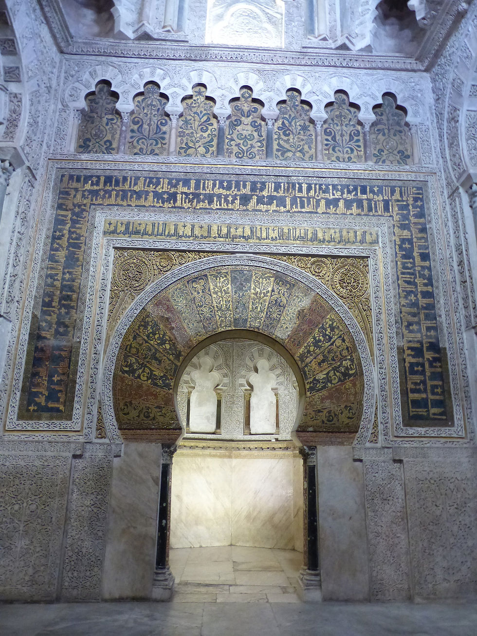 Le mihrab est l’espace le plus sacré de la mosquée ; il symbolise l’ouverture sur le monde divin. Plus qu’une niche, il s’agit à Cordoue d’une véritable petite pièce octogonale de 3,50 m de superficie recouverte d’une voûte en forme de coquille.